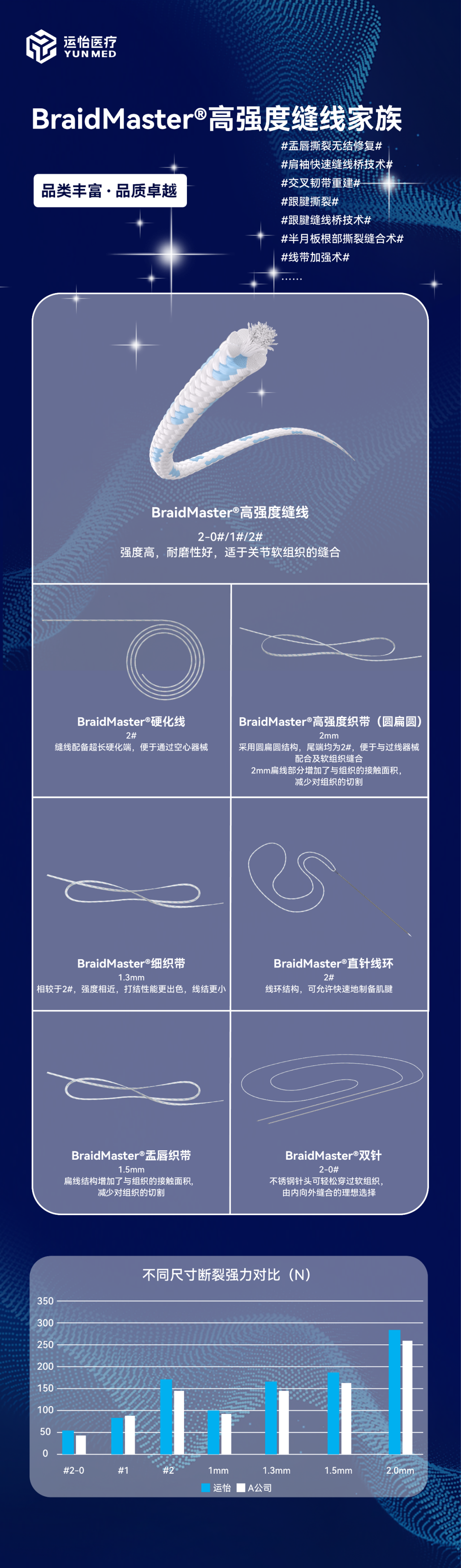 随着运动医学在中国蓬勃发展,临床对于植入级缝线的要求越来越高。为了满足临床日益多元的使用需求,运怡医疗积极布局III类BraidMaster®高强度缝线,经过不懈努力,完成了高强度缝线、硬化线、高强度织带、带针缝线、盂唇织带、细织带等多款III类缝线产品的上市,大幅度提升了运怡医疗运动医学耗材产品线竞争实力。